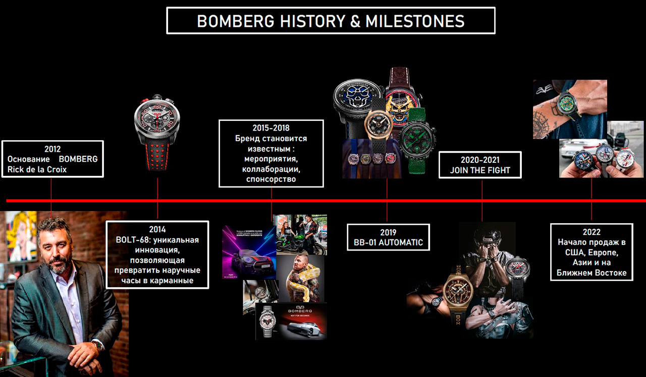 В начале 2013 года они представили свою первую коллекцию под названием "1968" в Базеле. BOMBERG прокладывает свой путь в традиционной индустрии. Компания создает часы для людей ярких, харизматических и уверенных в себе, находя единомышленников по всему миру - в США, Азии и Европе.