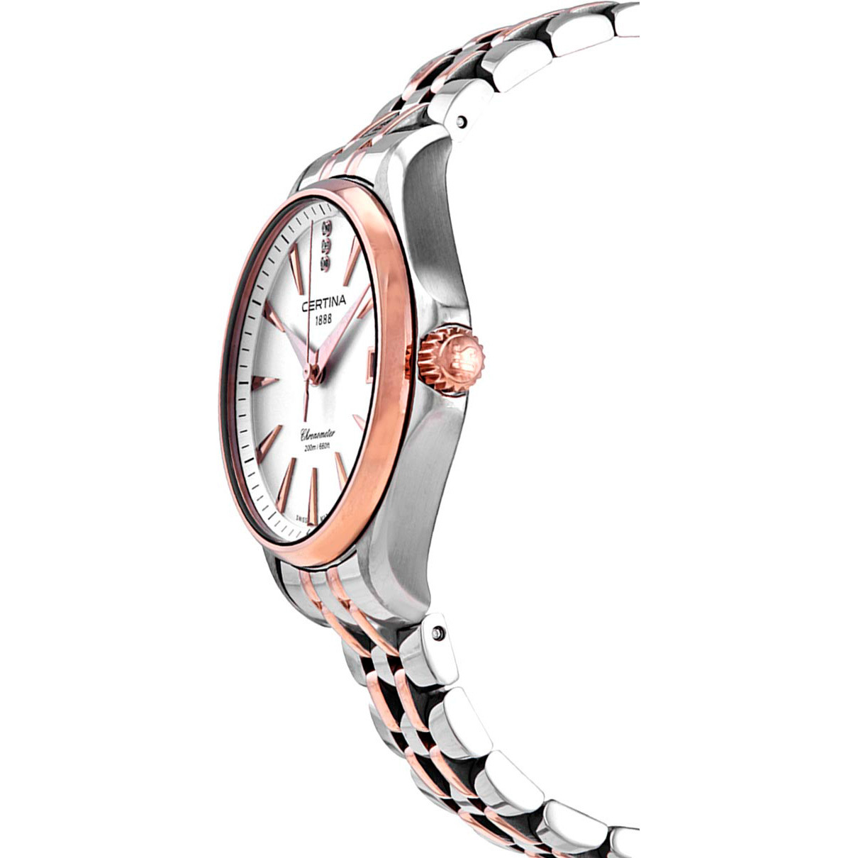 Корпус:  Корпус из нержавеющей полированной/матовой стали, безель с PVD - покрытием розового цвета. Металлик циферблат украшен тримя бриллиантами. Стрелки и риски золотистого цвета. Сапфировое стекло с антибликовым покрытием. Диаметр 34 мм. Водостойкость 100 м. Система DS.