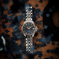Корпус: Корпус из нержавеющей полированной/матовой стали, безель с PVD - покрытием розового цвета. Серый циферблат украшен тримя бриллиантами. Стрелки и риски золотистого цвета. Сапфировое стекло с антибликовым покрытием. Диаметр 33,8 мм. Водостойкость 200 м.