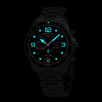 Функции: Индикация часов, минут при помощи центральных стрелок. Маленькая, отдельно вынесенная секундная стрелка. Дата в положении "6 часов". Хронограф.