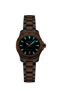 Корпус: Корпус из нержавеющей стали с PVD покрытием. Сапфировое стекло с антибликовым покрытием. Графитовый циферблат, позолоченные стрелки и часовые индексы. Вращающийся безель. Диаметр 29 мм. Водонепроницаемость 200 метров.