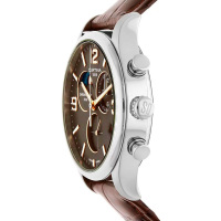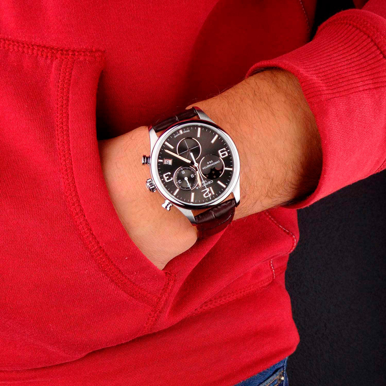 Функции: Индикация часов, минут при помощи центральных стрелок. Хронограф, индикация фазы луны и лунного цикла, индикация даты на "4" часа, вынесенная секундная стрелка на "6" часов.
