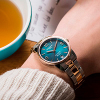 Корпус: Корпус из полированной/матовой нержавеющей стали с PVD - покрытием золотом. Зеленый циферблат с золотистыми стрелками и часовыми индексами. Сапфировое стекло. Диаметр 33 мм. Водостойкость 100 м. Система DS.