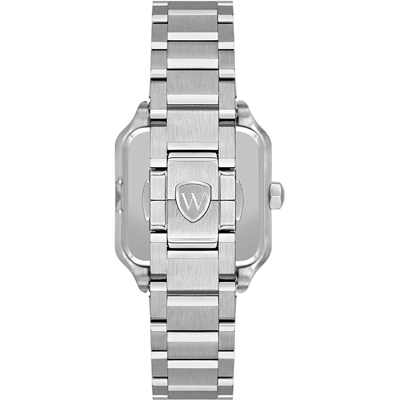 Корпус: Квадратный корпус из нержавеющей стали 316L с частичным PVD покрытием. Циферблат серебристого цвета. Метки в виде штрихов и римских цифр. Секундная стрелка на конце декорирована буквой W. Сапфировое стекло устойчивое к появлению царапин. Граненая заводная головка с защитой украшена фирменным логотипом. Размер корпуса 32х32 мм, . Водонепроницаемость 30 метров.