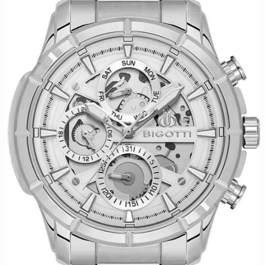 Корпус: Стильные мужские часы со скелетонизированным циферблатом. Корпус изготовлен из латуни и имеет надёжное износостойкое покрытие серебристого цвета. Циферблат серебристого цвета. Часовые индексы и стрелки с люминесцентным покрытием. Прочное минеральное стекло обеспечит защиту часов от повреждений. Диаметр: 44 мм. Водонепроницаемость: 50 м.