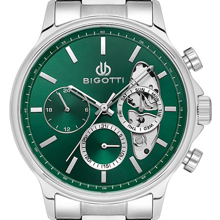 Корпус: Стильные мужские часы со скелетонизированным циферблатом. Корпус изготовлен из нержавеющей. Циферблат зелёного цвета. Часовые индексы и стрелки с люминесцентным покрытием. Прочное минеральное стекло обеспечит защиту часов от повреждений. Прочная задняя крышка. Диаметр: 42 мм. Водонепроницаемость: 50 м.