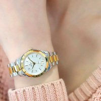 Корпус: Корпус выполнен из высококачественной стали с повышенной устойчивостью к коррозии с частичным PVD покрытием. Металлик циферблат в центральной части с гильошированным узором, украшенный кристаллами. Позолоченные полированные стрелки и часовые индексы. Сапфировое стекло устойчивое к появлению царапин, обладающее высокой прозрачностью. Диаметр: 28,5 мм. Водозащита: 30 м.