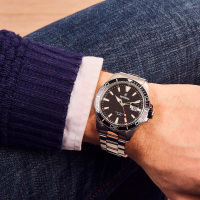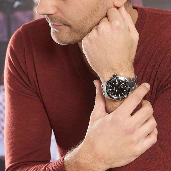 Корпус: Ударопрочный корпус часов сделан из нержавеющей стали. Чёрный циферблат украшен декоративным узором в виде горизонтальных полос, с серебристыми стрелками и часовыми индексами в виде штрихов с нанесенным люминесцентным покрытием, которое светится в темноте после непродолжительной зарядки на свету. Минеральное стекло устойчивое к возникновению царапин. Вращающийся безель. Рифленая заводная головка с защитой. Завинчивающаяся задняя крышка. Диаметр: 44,3 мм. Водонепроницаемость: 100 м.