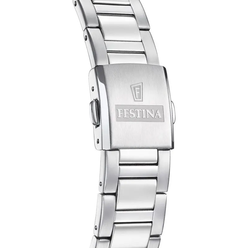 Ремешок: Надежный стальной браслет с раскладывающейся застежкой, которая украшена фирменным логотипом Festina.