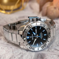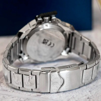 Корпус: Ударопрочный корпус часов сделан из нержавеющей стали. Однонаправленный вращающийся безель из нержавеющей стали. Чёрный циферблат со стрелками и часовыми индексами в виде штрихов с нанесенным люминесцентным покрытием, которое светится в темноте после непродолжительной зарядки на свету. Сапфировое стекло устойчивое к возникновению царапин. Завинчивающаяся заводная головка с защитой. Диаметр: 46 мм. Водонепроницаемость: 200 м.