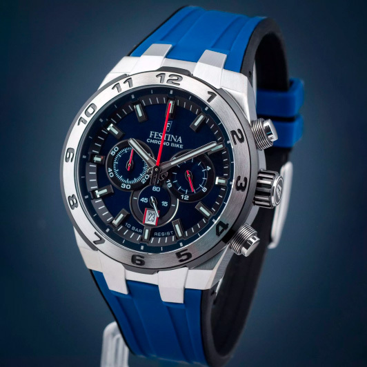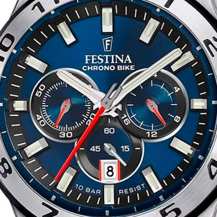 Корпус: Ударопрочный корпус часов сделан из нержавеющей стали. Безель с метками в виде арабских цифр. Циферблат выполнен по технологии Sunray (солнечные лучи) и украшен фирменным логотипом Festina Chrono Bike. Метки в виде штрихов. Рифленая заводная головка с защитой. Диаметр: 44,5 мм. Водонепроницаемость: 100 м.