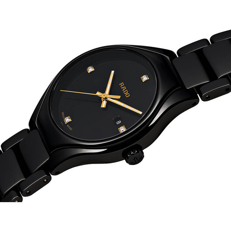Корпус: Корпус из высокотехнологичной чёрной керамики. Чёрный циферблат, украшен 4 бриллиантами общим весом 0,032 ct. Позолоченные стрелки в стиле Baton с люминесцентным покрытием по технологии SuperLumiNova®. Сапфировое стекло с антибликовым покрытием, устойчивое к появлению царапин, обладающее высокой прозрачностью. Диаметр: 30 мм. Водостойкость: 50 м.