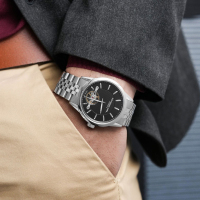Механизм: Швейцарский механизм с автоподзаводом, калибр RW1212, с запасом хода 38 часов и частотой 28 800 пк/час. Видимая со стороны циферблата работа анкерного спуска и колебания балансового колеса. Частично скелетонизированные мосты и платина механизма.