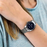 Корпус: Круглый корпус выполнен из полированной нержавеющей стали. Синий циферблат с узором гильоше. Накладные часовые индексы выполненый из стали. Стрелки с покрытием SuperLuminova, которое обеспечивает длительную подсветку в темное время суток. Устойчивое к возникновению царапин сапфировое стекло. Диаметр корпуса составляет 32 мм, толщина 8 мм. Водостойкость WR 50 (мытье рук, дождь).