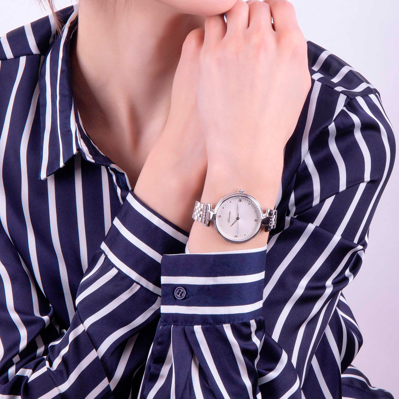 Корпус: Круглый корпус выполнен из полированной нержавеющей стали. Синий циферблат с узором гильоше. Накладные часовые индексы выполненый из стали. Стрелки с покрытием SuperLuminova, которое обеспечивает длительную подсветку в темное время суток. Устойчивое к возникновению царапин сапфировое стекло. Диаметр корпуса составляет 40 мм, толщина 7 мм. Водостойкость WR 50 (мытье рук, дождь).