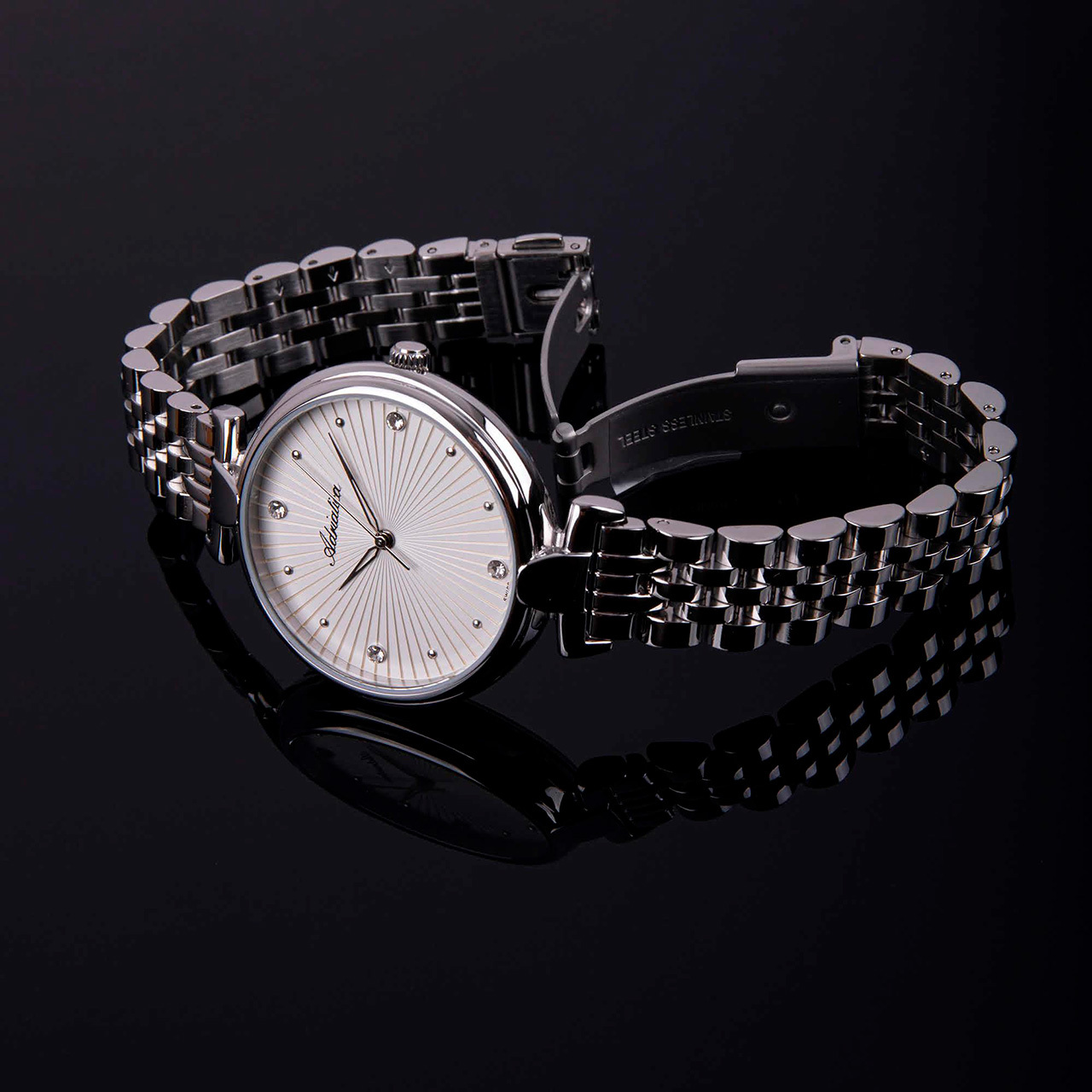 Ремешок: Браслет выполнен из нержавеющей стали. Браслетная раскладывающаяся застежка с дополнительным защитным фиксатором, гравировка с названием марки и ее эмблема.