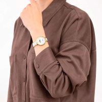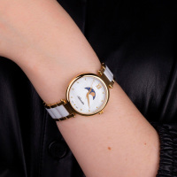 Ремешок: Браслет выполнен из нержавеющей стали с частичным жёлтым PVD покрытием золотом и белыми керамическими вставками. Раскладывающаяся застежка с гравировкой логотипа.