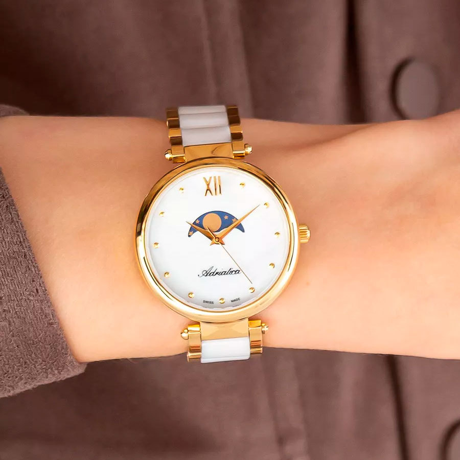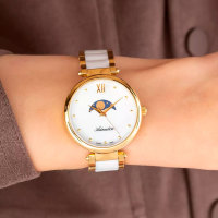 Корпус: Круглый корпус выполнен из полированной нержавеющей стали с жёлтым PVD покрытием. Белый перламутровый циферблат. Накладные часовые метки и стрелки выполнены из стали с золотым покрытием. Минеральное стекло. Диаметр корпуса составляет 34 мм, толщина 7 мм. Водостойкость WR 50 (мытье рук, дождь).