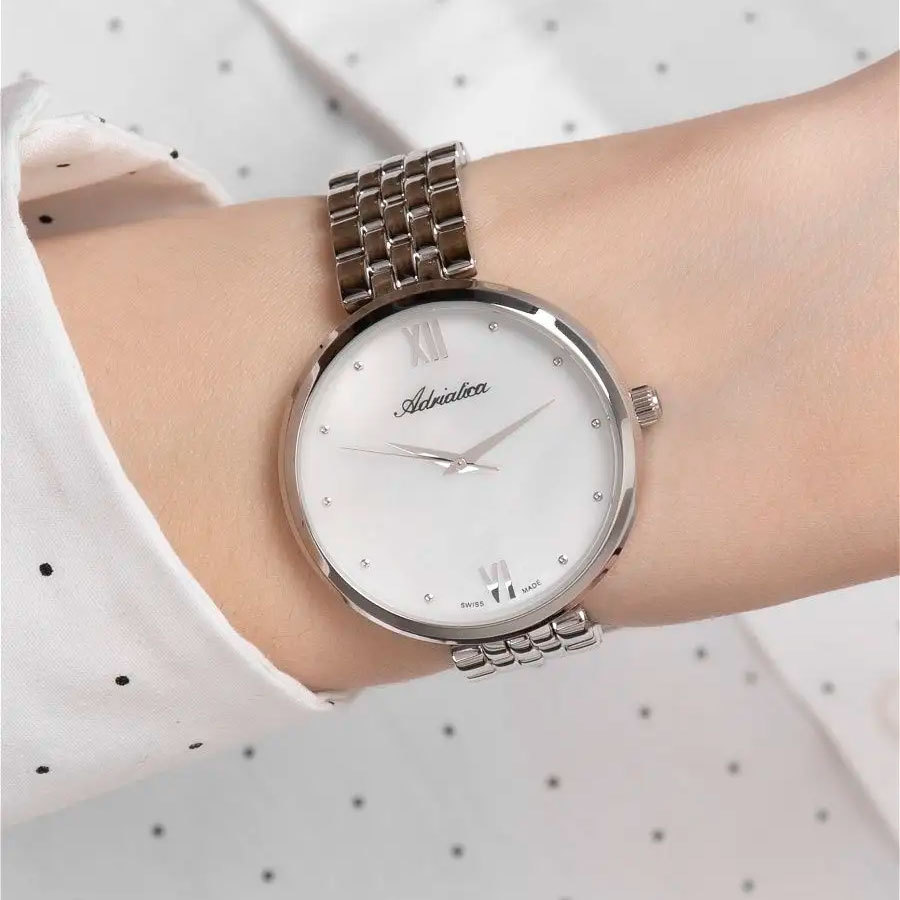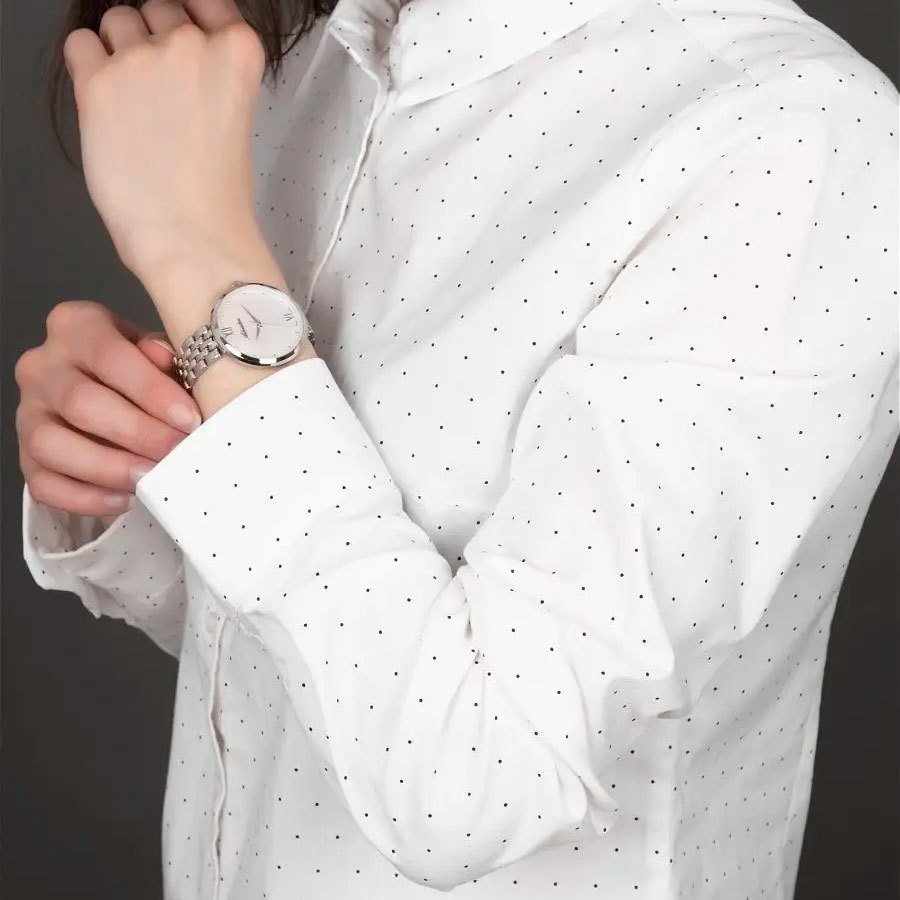 Корпус: Круглый корпус выполнен из полированной нержавеющей стали. Белый перламутровый циферблат. Накладные часовые метки и стрелки выполнены из стали. Минеральное стекло. Диаметр корпуса составляет 36 мм, толщина 8 мм. Водостойкость WR 30 (мытье рук, дождь).
