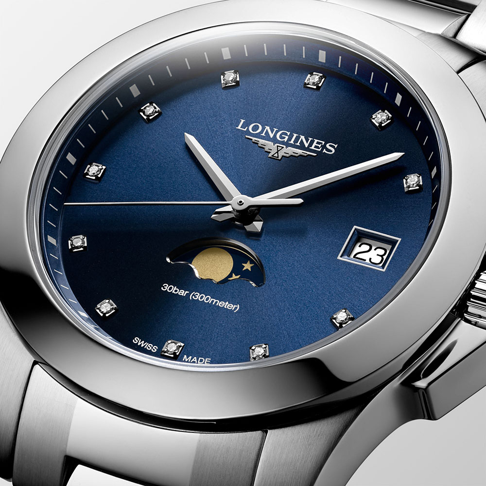 Корпус: Нержавеющая сталь. Циферблат синий, декорирован 11 бриллиантами, серебристые стрелки. Сапфировое стекло с антибликовым покрытием. Водонепроницаемость 300 метров. Размер 34 мм.
