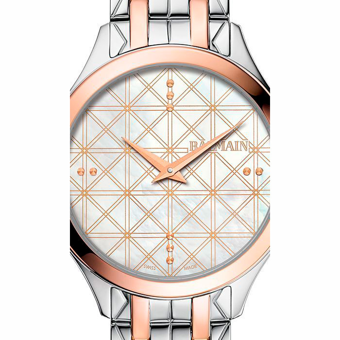 Корпус: Нержавеющая сталь с PVD - покрытием цвета розового золота. Циферблат перламутровый. Необычный рисунок циферблата защищен высокопрочным сапфировым стеклом. Заводная головка с защитой, украшена камнем в форме кабошона. Диаметр: 33,6 мм. Водостойкость: 50 м.