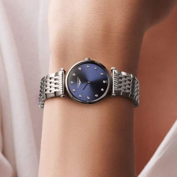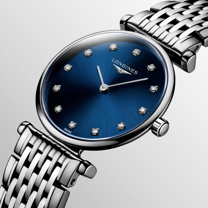 Корпус: Нержавеющая сталь, сапфировое стекло, 12 бриллиантов на циферблате. Размер 24 мм, водонепроницаемость 30 метров. Циферблат – синий.