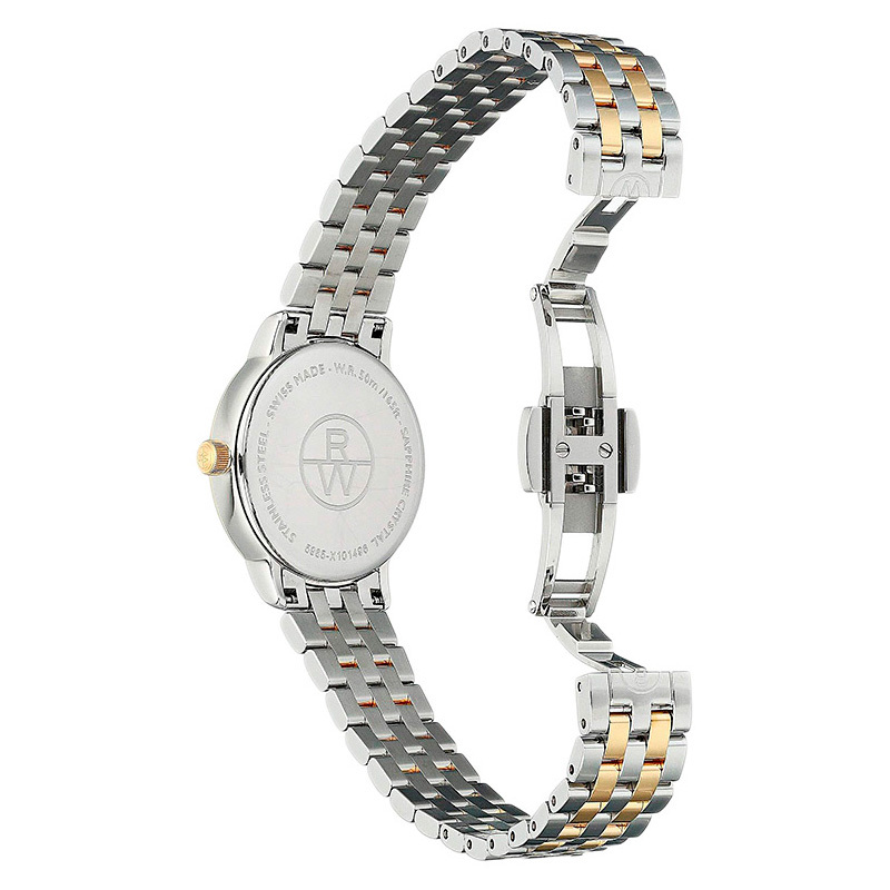 Корпус: Корпус из нержавеющей стали марки 316L. Безель и переводная коронка с PVD покрытием цвета жёлтого золота. Диаметр 29 мм, толщина 6,7 мм. Переводная коронка украшена логотипом RW. Сапфировое стекло. Циферблат из натурального перламутра инкрустирован 11 бриллиантами, общим весом 0,04 карата, граненые стрелки имеют покрытие цвета золота. Водостойкость 50 метров.