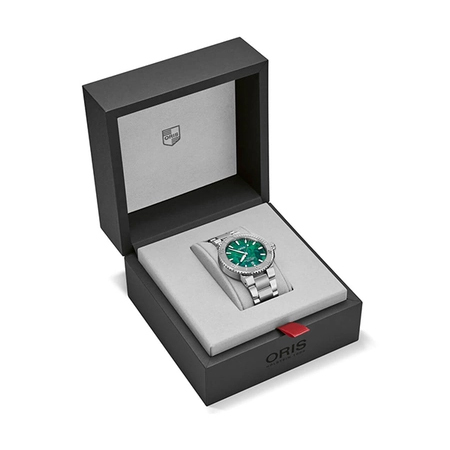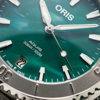 Коллекция: Bracenet Aquis Automatic. Новое сотрудничество Oris с Bracenet поддерживает миссию экологического предприятия по защите морей. Эти часы Aquis с калейдоскопическим зеленым циферблатом, выполненным из переработанных рыболовных сетей. Каждый циферблат уникален благодаря случайному процессу. В результате получился циферблат, вдохновлённый океаном, - ежедневное напоминание о вашем вкладе в сохранение океана.