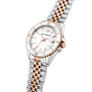 Корпус: Корпус выполнен из высококачественной стали с повышенной устойчивостью к коррозии с частичным PVD покрытием. Белый циферблат. Сапфировое стекло, которое не царапается при механическом воздействии. Рифленый безель. Завинчивающаяся заводная коронка. Диаметр корпуса: 35 мм. Водозащита до 100 метров позволит плавать.