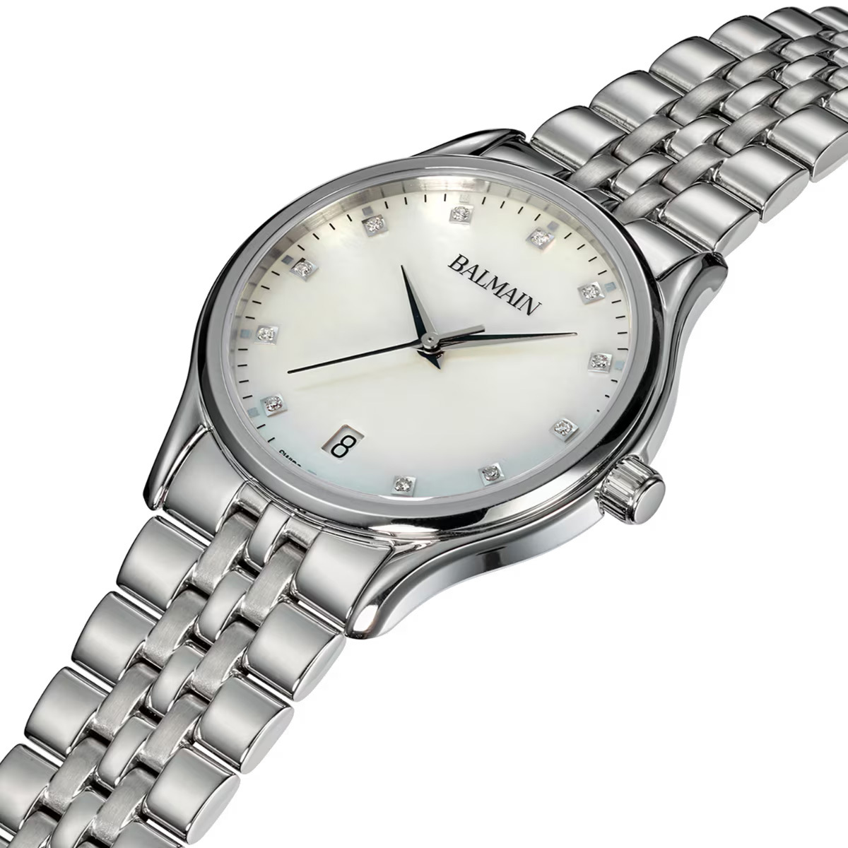 Корпус: Корпус выполнен из нержавеющей стали 316L, которая чрезвычайно прочна и устойчива к коррозии, поверхность с полировкой до зеркального блеска. Белый перламутровый циферблат украшен 11 бриллиантами Top Wesselton VS-SI общим весом 0,041 карата. Часовые индексы и стрелки выполнены из стали. Сапфировое стекло, устойчивое к появлению царапин, обладающее высокой прозрачностью. Диаметр корпуса составляет 32 мм. Водонепроницаемость: 30 м.