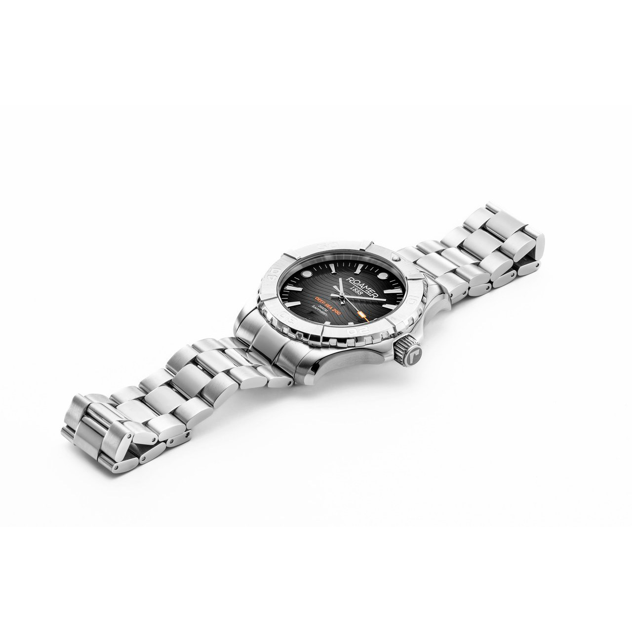 Корпус: Нержавеющая сталь, вращающийся безель. Черный циферблат с волнистой текстурой . Серебристые стрелки и часовые индексы с люминесцентным покрытием. Сапфировое стекло с антибликовым покрытием. Водонепроницаемость: 200 метров. Диаметр: 43 мм.