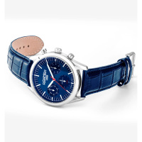 Корпус: Круглый корпус выполнен из нержавеющей стали, поверхности с матовой шлифовкой сатинированием и глянцевой полировкой. Циферблат синего цвета с шлифовкой "солнечные лучи". Аппликация часовых индексов и стрелки с алмазной огранкой имеют полировку до зеркального блеска. Фотолюминесцентный состав Luminova на стрелках и часовых индексах, светящийся в темноте. Чтобы подчеркнуть циферблат часов, секундная стрелка выделена красным цветом. Сапфировое стекло с антибликовым покрытием. Диаметр корпуса составляет 43 мм. Водостойкость 10 ATM.