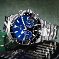 Корпус: Часы изготовлены из нержавеющей стали 316L, поверхности с матовой шлифовкой сатинированием и глянцевой полировкой. Этот тип стали, благодаря своему составу, особенно устойчив к коррозии, отличается высокой прочностью и устойчивостью к царапинам. Вращающийся в одну сторону безель с PVD покрытием. Синий циферблат. Стальные часовые индексы и стрелки с люминесцентным покрытием Super-LumiNova, обеспечивают идеальную читаемость. Сапфировое стекло с антибликовым покрытием, предотвращающее появление неприятных отражений, которые мешают правильному считыванию циферблата при определенных условиях освещения. Завинчивающаяся заводная головка. Диаметр: 46 мм. Водонепроницаемость: 200 м.