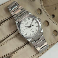 Корпус: Нержавеющая сталь марки 316 L. Гильошированный циферблат белого цвета. Стрелки и часовые индексы серебристого цвета покрыты люминесцентным составом SuperLuminova. Прозрачная задняя крышка. Сапфировое стекло с антибликовым покрытием. Диаметр: 41 мм. Водонепроницаемость: 50 метров.