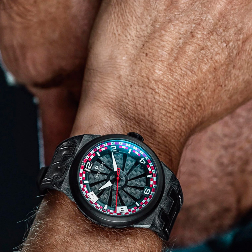 Корпус: Круглый корпус выполнен выполнен из карбона и высокосортной нержавеющей стали со стойким к царапинам PVD покрытием черного цвета. Циферблат с видимым ротором автоподзавода чёрного цвета. Поверхность циферблата под вращающимся в двух направлениях ротором черного цвета. На внешней стороне циферблата нанесена контрастная красно-белая окраска, обращающаяся к гоночной эстетике Формулы 1 в виде сигнальных флагов. Аппликация цифр с люминесцентным составом светящимся в темноте. Сапфировое стекло имеет антибликовое покрытие с обеих сторон. Диаметр корпуса 44 мм, толщина - 13,8 мм. Заводная коронка украшена миниатюрой с эмблемой марки. Задняя крышка с прозрачным стеклом. Водостойкость 100 метров.