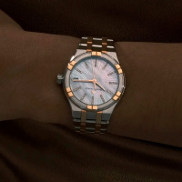 Корпус: Круглый корпус выполнен из нержавеющей стали, поверхности с матовой шлифовкой сатинированием и глянцевой полировкой. Выступы безеля с PVD покрытием цвета розового золота. Циферблат из натурального перламутра. Аппликация часовых индексов и стрелки с алмазной огранкой имеют золотое покрытие и полировку до зеркального блеска. Часовые индексы украшены бриллиантами. Фотолюминесцентный состав SLN на стрелках, светящийся в темноте. Сапфировое стекло с антибликовым покрытием. Диаметр корпуса составляет 35 мм. Водостойкость 10 ATM.