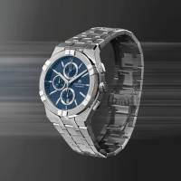 Корпус: Круглый корпус выполнен из нержавеющей стали, поверхности с матовой шлифовкой сатинированием и глянцевой полировкой. Циферблат глубокого синего цвета с шлифовкой в стиле «солнечные лучи», вспомогательные индикаторы хронографа с гильошированием в виде спиральных узоров. Аппликация часовых индексов и стрелки с алмазной огранкой имеют родиевое покрытие и полировку до зеркального блеска. Фотолюминесцентный состав Super-LumiNova на стрелках, светящийся в темноте. Сапфировое стекло с антибликовым покрытием защищает циферблат от царапин и обеспечивает отличную читаемость при любом освещении. Диаметр корпуса составляет 42 мм, толщина - 11 мм. Водозащита до 10 ATM (100 метров) делает часы подходящими для плавания.