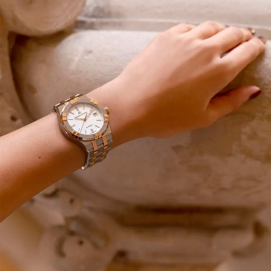 Ремешок: Браслет из нержавеющей стали с литыми звеньями в пять рядов, два центральных ряда с золотым покрытием, система быстрой замены ремешка/браслета, браслетная застежка с тройным сложением – «бабочка», раскладывающаяся при нажатии кнопок двойной блокировки, гравировка Maurice Lacroix.