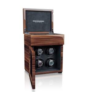 Механизм: Шкатулка с приводом (watch winders) прямоугольной формы, для хранения и поддержания в рабочем состоянии наручных часов с автоподзаводом в количестве 4 штук. Шкатулка оснащена мощным двигателем с бесшумным ходом и достаточно длительным сроком эксплуатации. Завод механизма часов осуществляет двигатель, совершающий поочерёдное вращение по часовой стрелке, против часовой стрелки и вращение в двух направлениях со скоростью 600; 900; 1200; 1500; 1800; 2100 оборотов в день. На жидкокристаллическом дисплее, созданном по эксклюзивной технологии, отражена функция контроля работы двигателя. Энергия для двигателя и жидкокристаллического дисплея поступает от сети переменного тока через входящий в комплект адаптер.