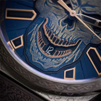 Корпус: Круглый корпус из нержавеющей стали марки 316L украшен замысловатой гравировкой Древа Жизни, символизирующей гармонию и связь. Синий циферблат, эргономичная завинчивающаяся заводная головка на 12 часах. На циферблате изображен уникальный рельефный череп. Фотолюминесцентное покрытие Super-Luminova® на глазах и зубах, а также на индексах и стрелках добавляет остроты, обеспечивая при этом идеальную читаемость даже в самых темных условиях. Сапфировое стекло с антибликовым покрытием. Диаметр корпуса 43 мм, толщина - 14,2 мм. Задняя крышка с прозрачным стеклом. Водостойкость 100 метров.