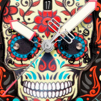 Корпус: Круглый корпус выполнен из нержавеющей стали марки 316L, с PVD покрытием черного цвета. Яркий и цветочный сахарный череп на циферблате. Фотолюминесцентное покрытие Super-Luminova® на индексах и стрелках добавляет остроты, обеспечивая при этом идеальную читаемость даже в самых темных условиях. Уникальный дизайн с завинчивающейся заводной головкой в ​​положении «12 часов» и кнопок хронографа. Сапфировое стекло с антибликовым покрытием. Диаметр: 45 мм. Водозащита: 50 м.