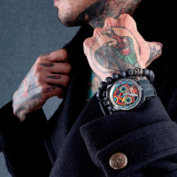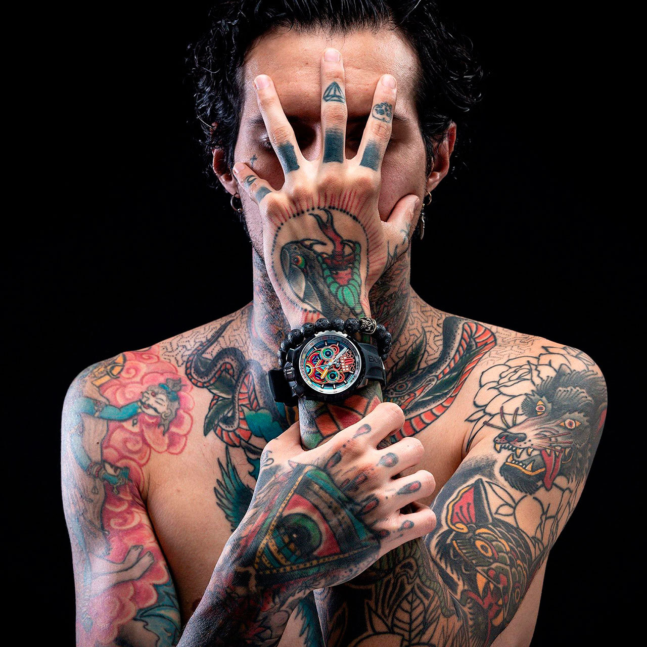 Корпус: Круглый корпус выполнен из нержавеющей стали марки 316L, с PVD покрытием черного цвета. Циферблат украшен стилизованной маской майя. Культура майя оказала сильное влияние на воображение многих людей, цивилизация майя много столетий назад разработала уникальную систему письма, а также сложную математику и астрономию, освоила спорт, построила пирамиды, создала свою своеобразную архитектуру и многое другое. Фотолюминесцентное покрытие Super-Luminova® на индексах и стрелках добавляет остроты, обеспечивая при этом идеальную читаемость даже в самых темных условиях. Уникальный дизайн с завинчивающейся заводной головкой в ​​положении «12 часов» и кнопок хронографа. Сапфировое стекло с антибликовым покрытием. Диаметр: 45 мм. Водозащита: 50 м.