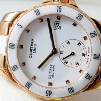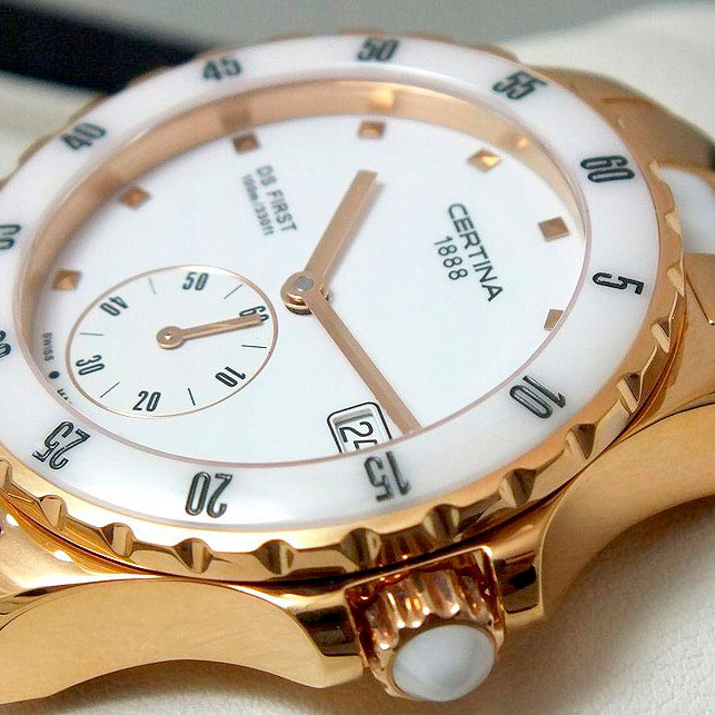 Корпус: Корпус из нержавеющей полированной/матовой стали с PVD - покрытием розового золота . Безель с 60 - минутной шкалой на керамическом белом кольце. Белый циферблат. Стрелки и часовые индексы золотистого цвета. Сапфировое стекло. Диаметр 34.8 мм. Водостойкость 100 м. Система DS.