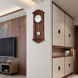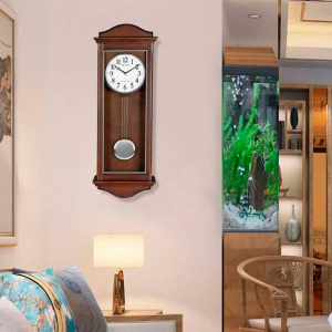 Цвет: Корпус часов тёмно коричневого цвета (орех). Циферблат белый. Стрелки чёрного цвета. Контрастные арабские цифры. Стальной маятник. Стекло с отделкой кантом цвета металик.
