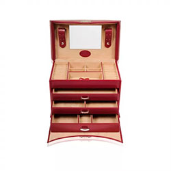 Описание: Шкатулка "Merino 17" для украшений с открывающимися отделениями. Корпус обтянут экокожей цвета бордо. Шкатулка с выдвижными ящиками с отделениями разной величины. Верхний ярус оснащен валиками для колец, мелкими ячейками, а также дополнительным отделением с крышечкой. В одном из нижних ярусов – отдел для колье. На внутренней стороне крышки – ремешки с отверстиями для сережек и зеркало. Надежный патентованный замок. Удобная ручка для переноски. Внутри шкатулка отделана мягким бархатистым велюром бежевого цвета.