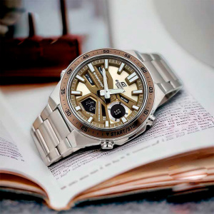 Корпус: Корпус выполнены из высококачественной стали с антикоррозийными свойствами. Безель с IP-покрытием. Циферблат бежевого цвета с контрастными индексами. Метки в виде штрихов. Необритовое светонакопительное покрытие обеспечивает длительное послесвечение в темноте даже после кратковременного нахождения на свету. Минеральное стекло устойчиво к появлению царапин. Завинчивающаяся заводная головка с защитой. Диаметр 47 мм. Водонепроницаемость 100 М.