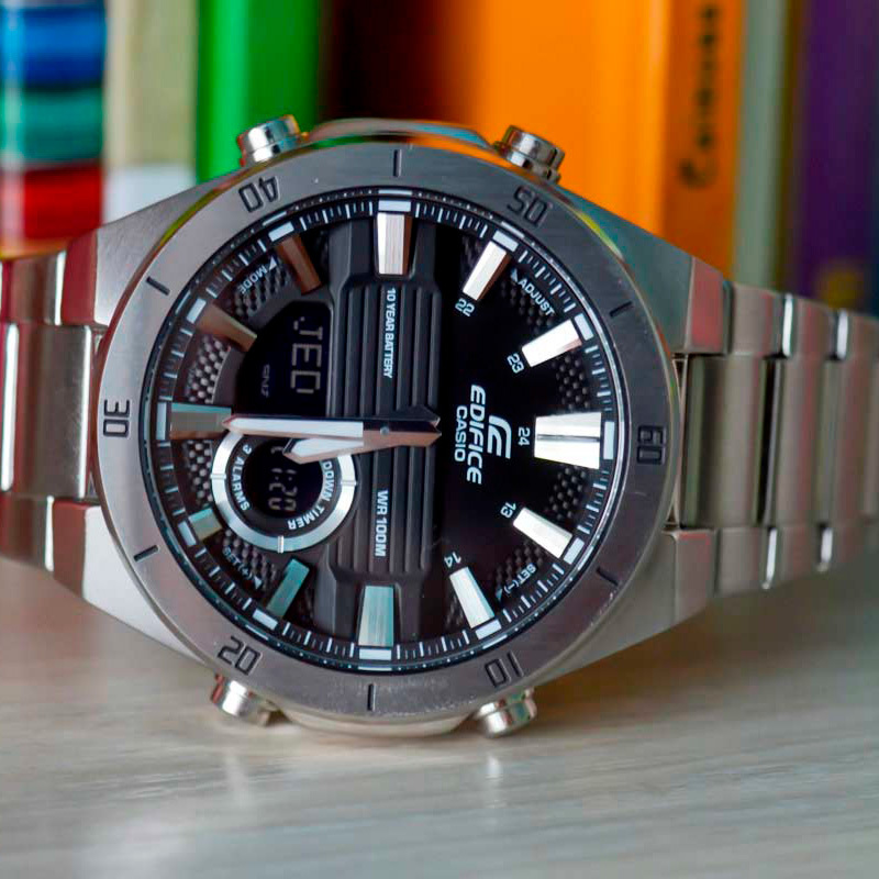 Функции: Часы с аналогово-цифровым отображением времени и 10-ти летним аккумулятором. Индикация часов и минут при помощи центральных стрелок. Записная книжка на 30 ячеек памяти для записи имен и телефонных номеров, каждая запись может включать в себя текст из 8 букв и 12 цифр. Мировое время – 30 городов (29 часовых поясов), возможность включения/отключения летнего времени. 12-ти и 24-х часовой формат времени. Секундомер с точностью показаний 1/100с и временем измерения 24ч. Сплит-хронограф. Таймер обратного отсчета от 1мин до 24ч. 3 будильника, один с функцией Snooze, ежечасный сигнал.