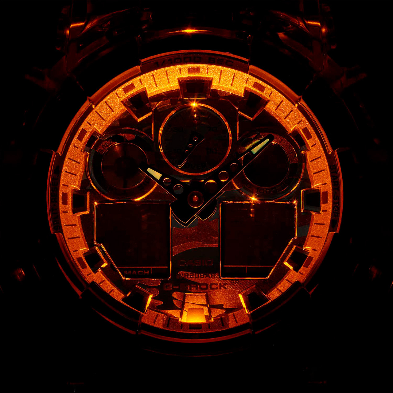 Корпус: Корпус часов изготовлен из прозрачного пластика с камуфляжным серым циферблатом. Метки в виде штрихов. Необритовое светонакопительное покрытие обеспечивает длительное послесвечение в темноте даже после кратковременного нахождения на свету. Минеральное стекло устойчиво к появлению царапин. Диаметр 51 мм. Водонепроницаемость 200 М.