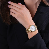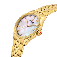 Корпус: Высококачественная нержавеющая сталь с повышенной устойчивостью к коррозии с IP покрытием. Перламутровый циферблат белого цвета. Позолоченные стрелки с люминесцентным покрытием, которое светится в темноте после непродолжительной зарядки на свету. Минеральное стекло защищает часы от повреждений. Диаметр корпуса составляет 36 мм. Водостойкость WR 50.