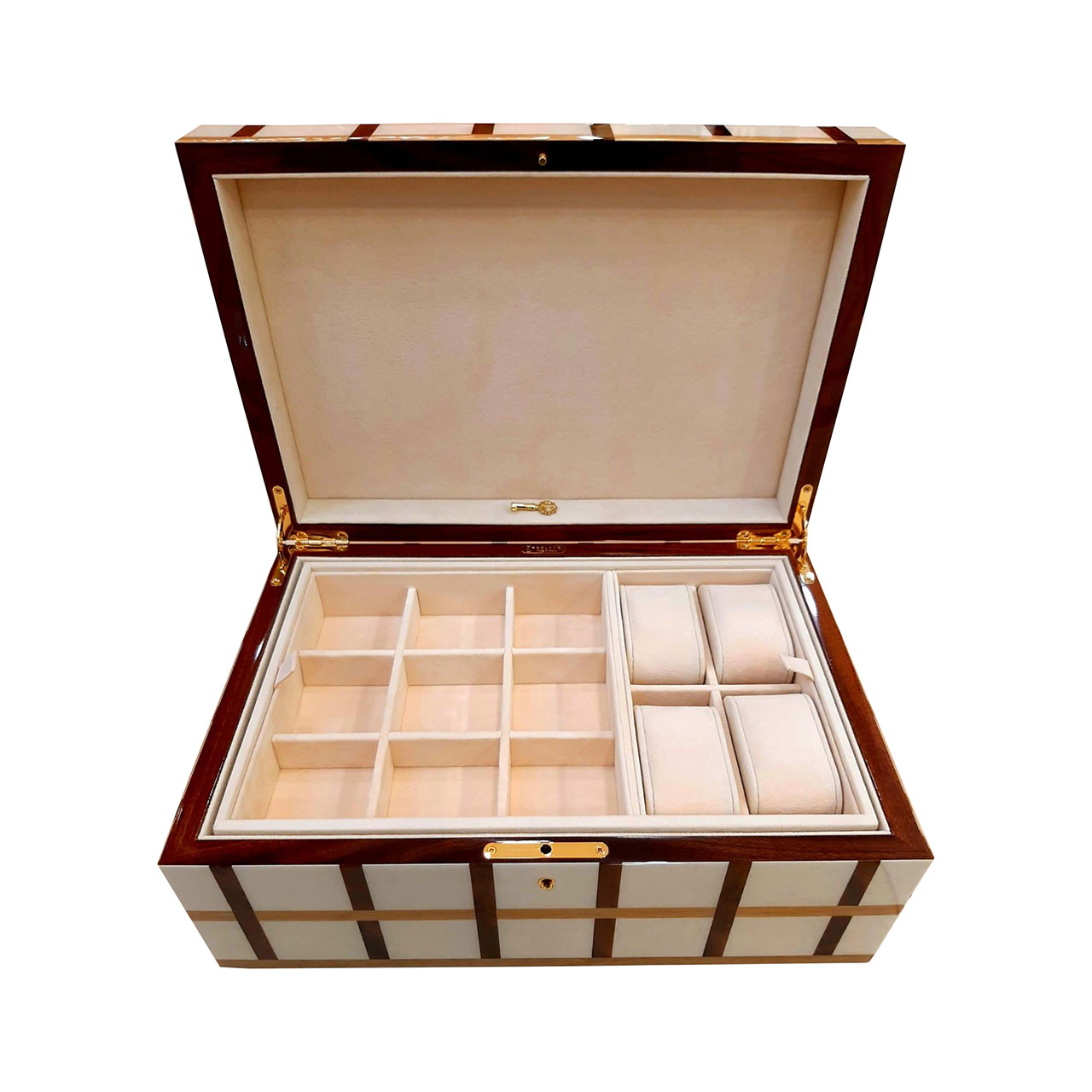 Материал: Шкатулки для хранения изготавливаются вручную с использованием пятнадцати производственных технологий. Используются несколько процессов обработки: тщательная шлифовка, оттачивание, лакировка. Внутри шкатулки покрываются бархатом или плюшевым вельветом, а позолоченные части обрабатываются раствором, препятствующим окислению. Корпус выполнен из натурального дерева.
